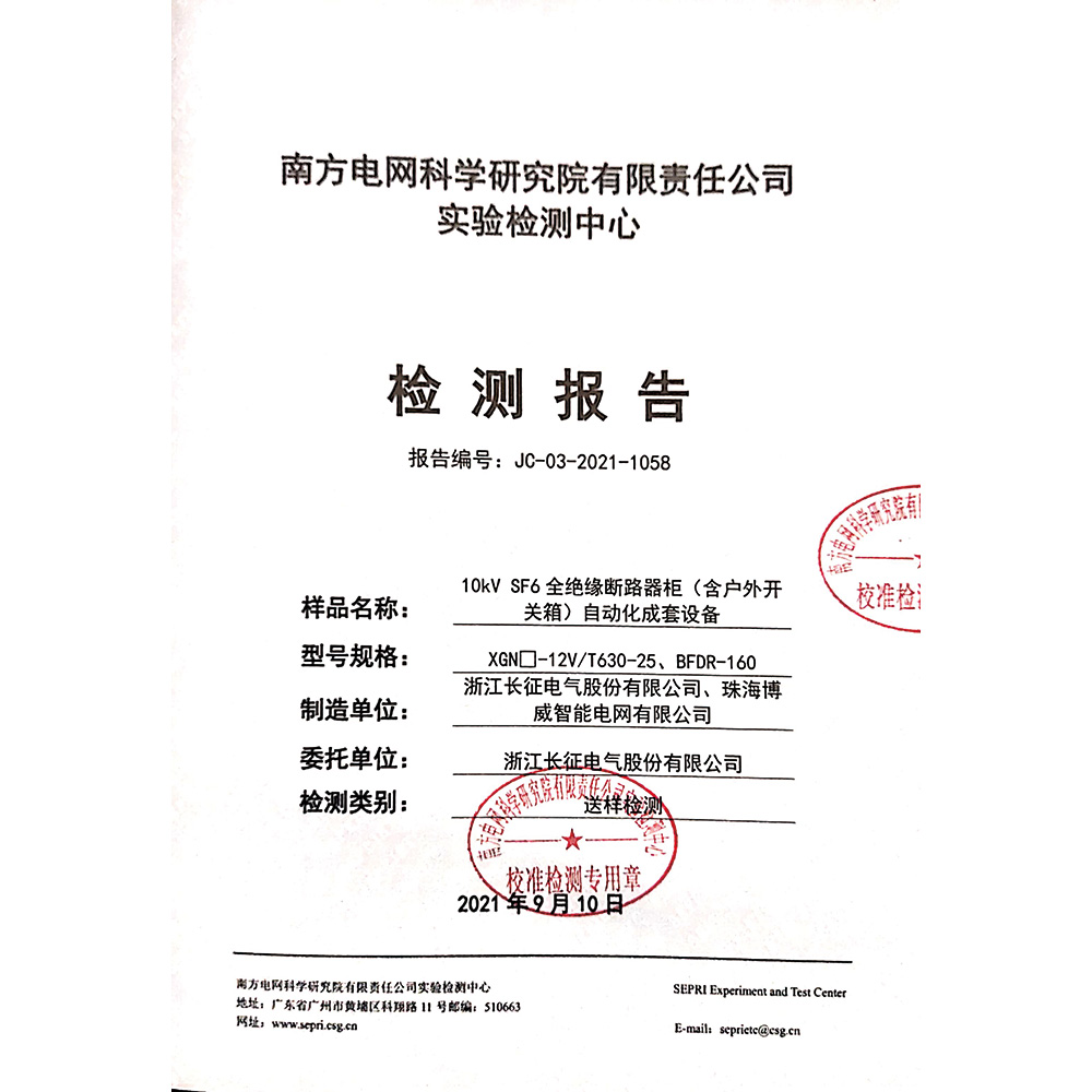 XGN□-12V/T630-25、BFDR-160 10kV SF6 全絕緣斷路器柜(含戶外開(kāi)關(guān)箱)自動(dòng)化成套設(shè)備 檢測(cè)報(bào)告