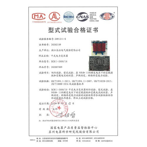 SCB11-2000/10干式電力變壓器 型式試驗合格證書