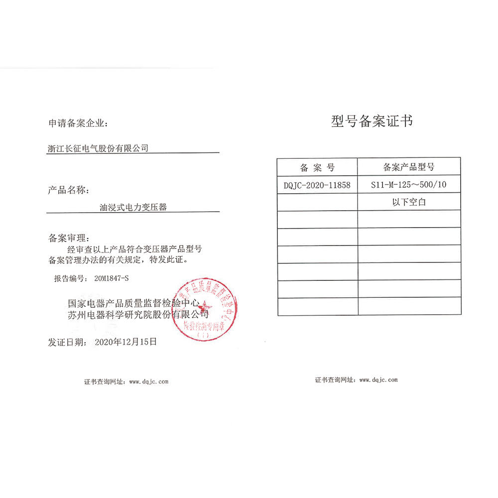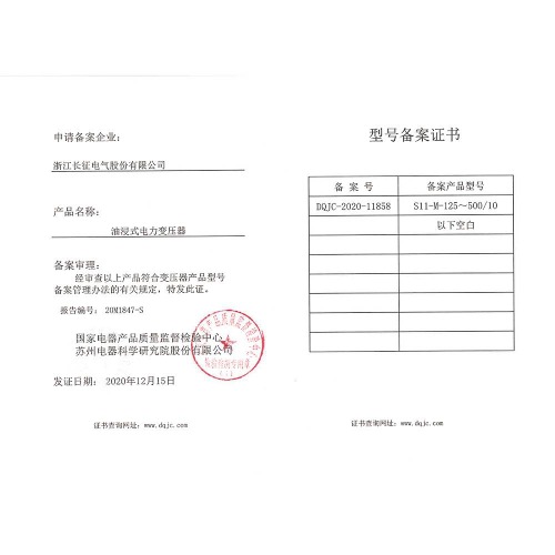 S11-M-125~500/10油浸式電力變壓器 型號備案證書