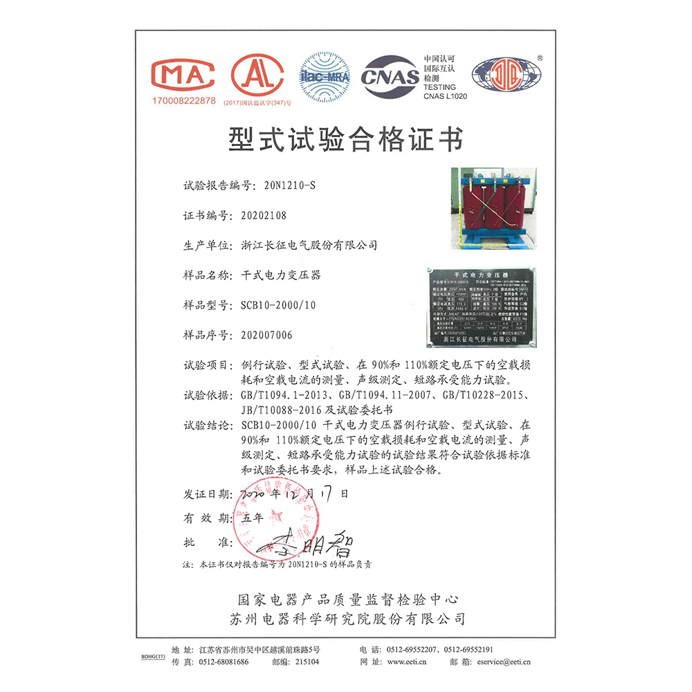 SCB10-2000/10干式電力變壓器 型式試驗合格證書