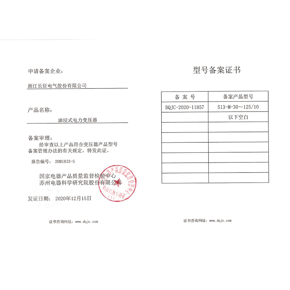 S13-M-30~125/10油浸式電力變壓器 型號備案證書