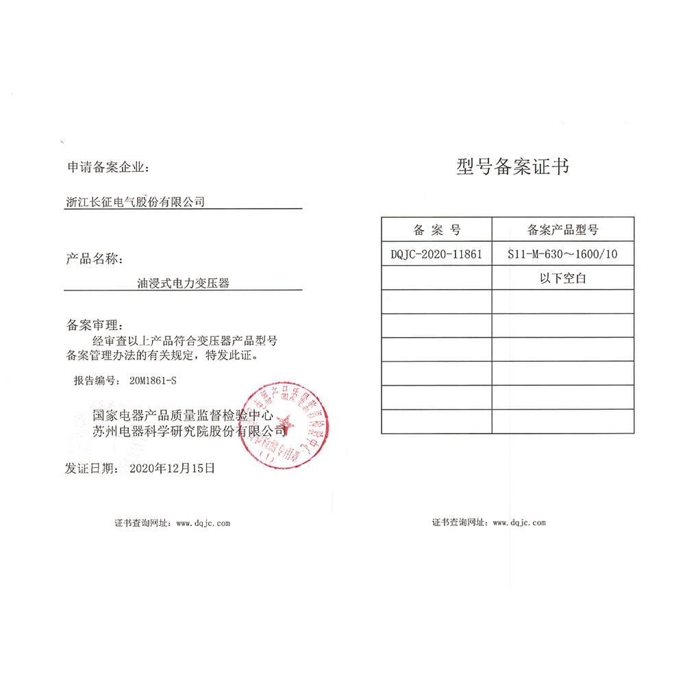 S11-M-630~1600/10油浸式電力變壓器 型號備案證書