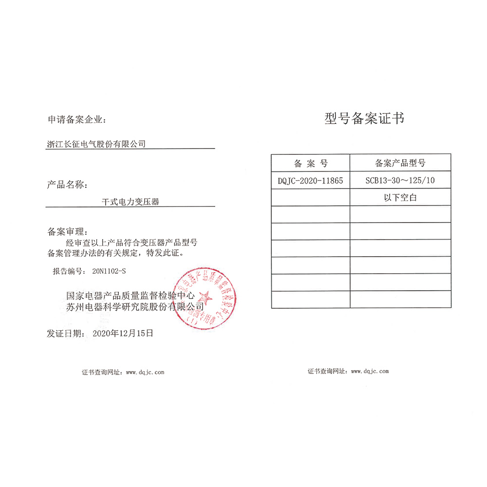 SCB13-30~125/10干式電力變壓器 型號備案證書