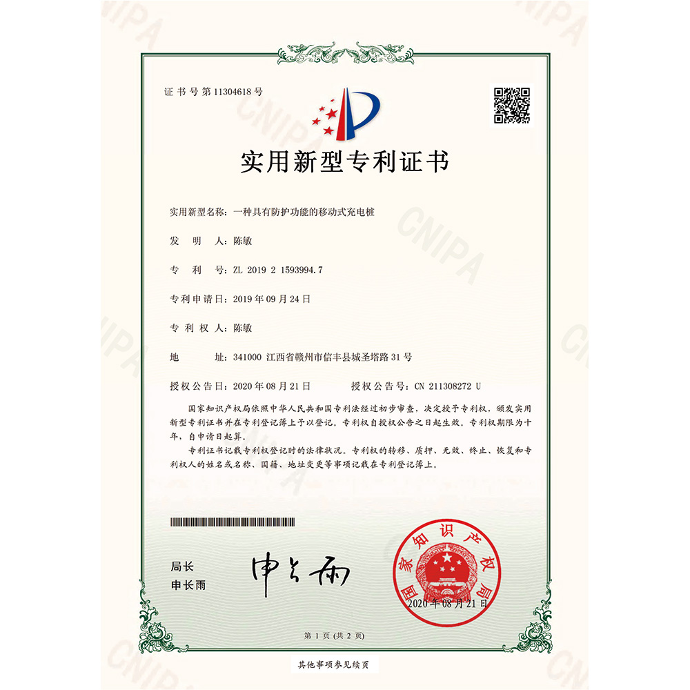 一種具有防護(hù)功能的移動式充電樁 實(shí)用新型專利證書