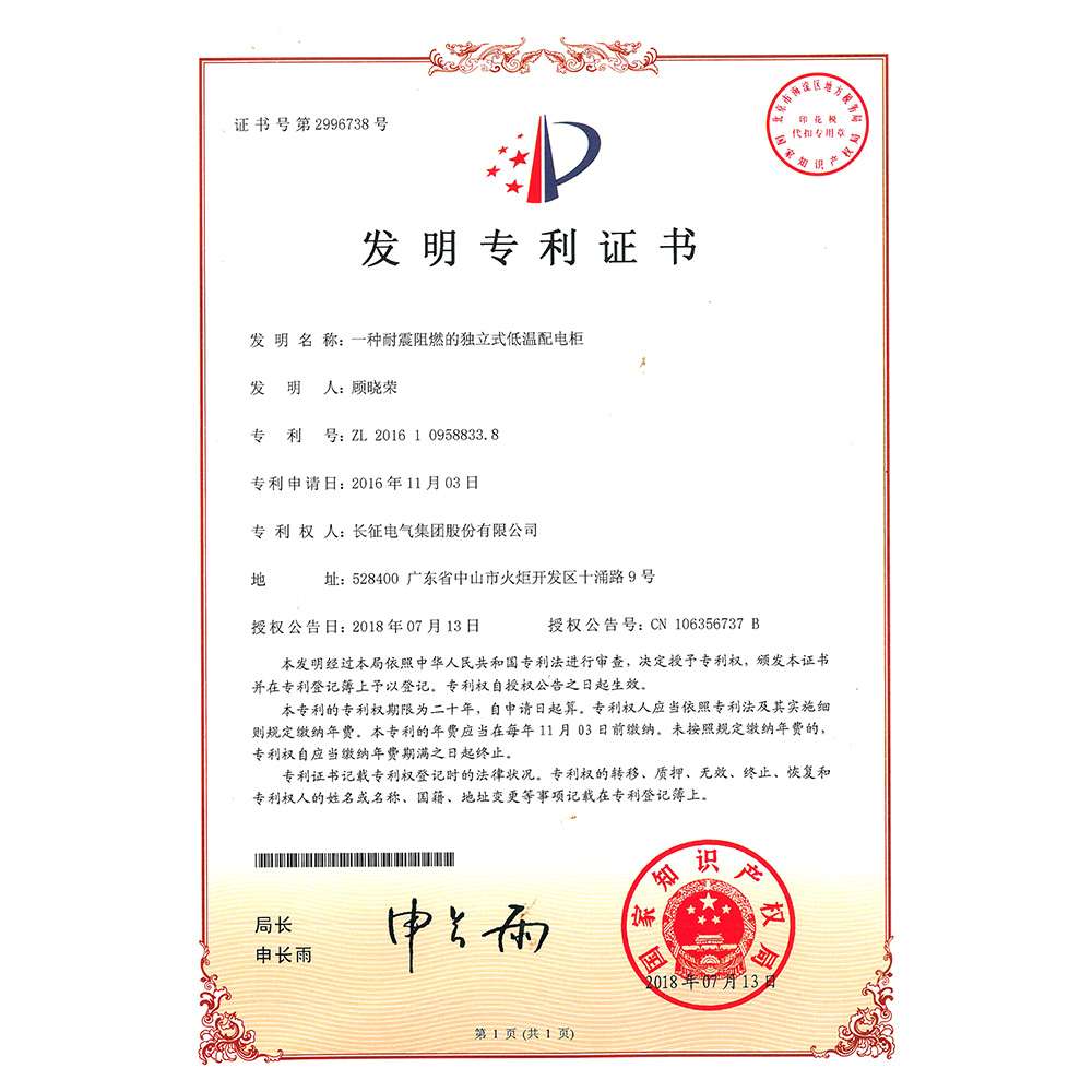 一種耐震阻燃的獨(dú)立式低溫配電柜 發(fā)明專利證書
