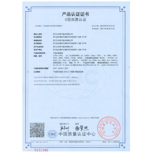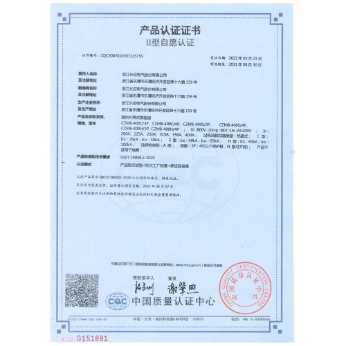 CZM8塑料外殼式斷路器 產(chǎn)品認(rèn)證證書