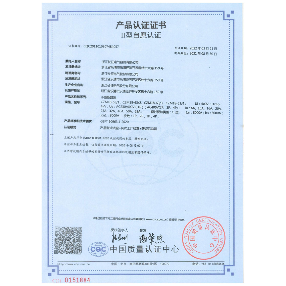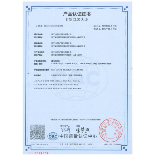 CZM18-63小型斷路器 產(chǎn)品認(rèn)證證書