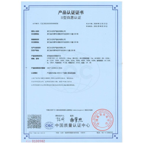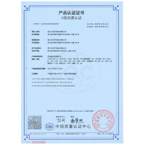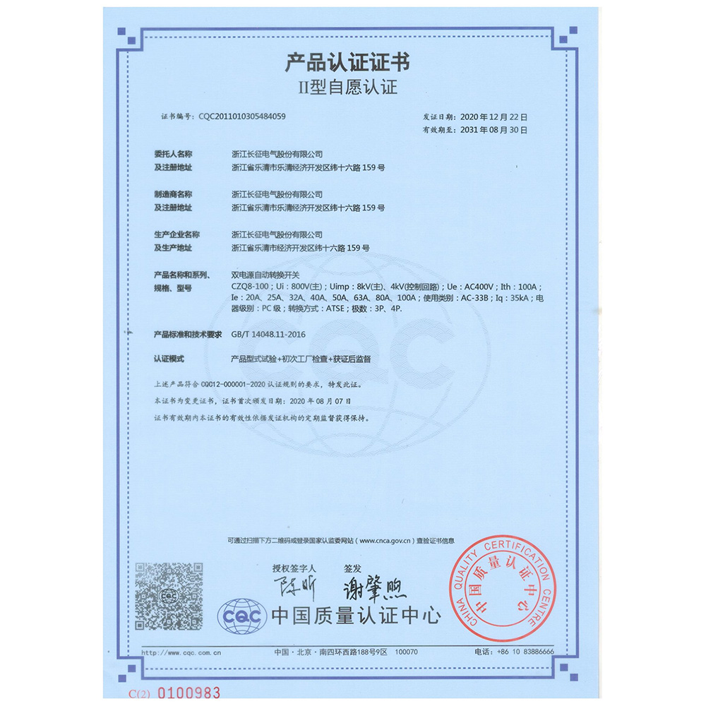 CZQ8-100雙電源自動轉(zhuǎn)換開關(guān) 產(chǎn)品認(rèn)證證書