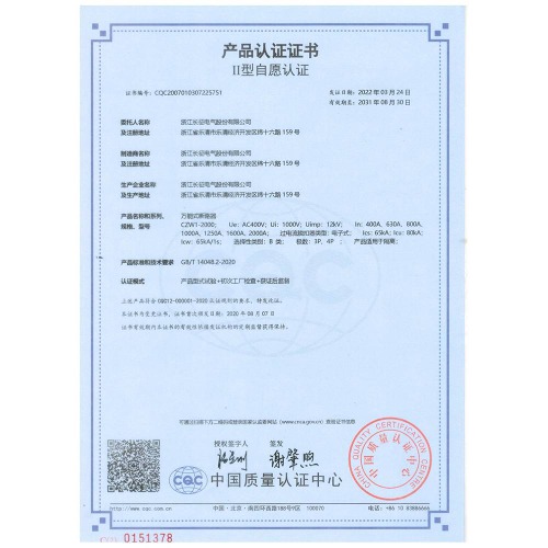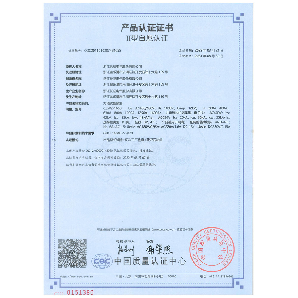 CZW2-1600萬能式斷路器 認(rèn)證證書