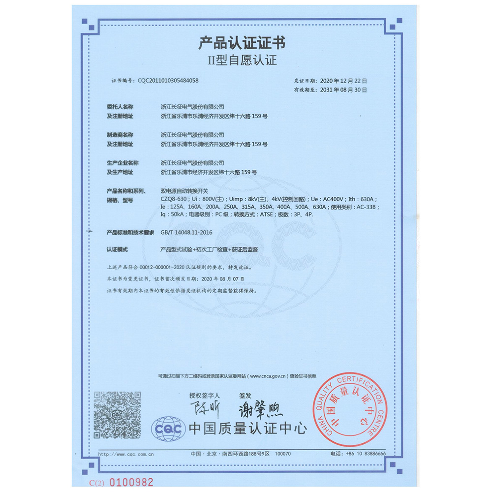 CZQ8-630雙電源自動轉(zhuǎn)換開關(guān) 產(chǎn)品認(rèn)證證書