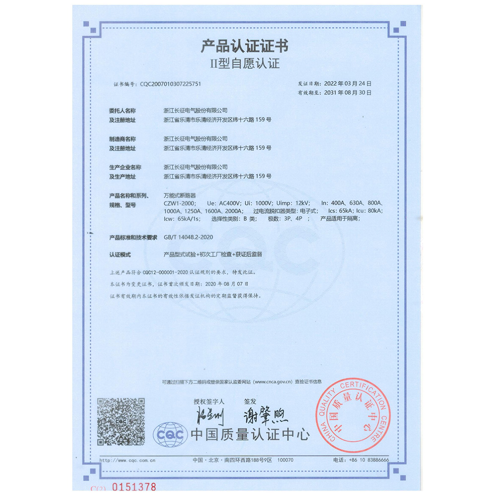 CZW1-2000萬能式斷路器 產(chǎn)品認(rèn)證證書