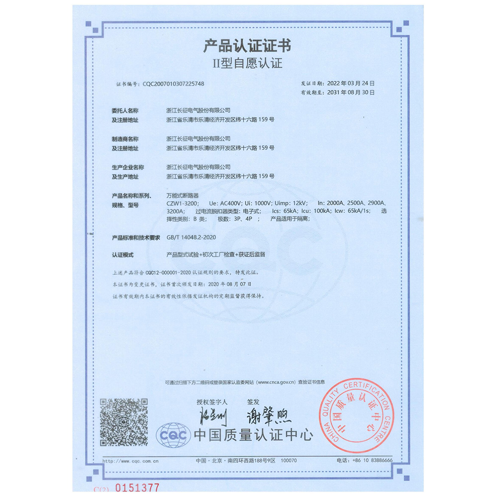 CZW1-3200萬能式斷路器 產(chǎn)品認(rèn)證證書