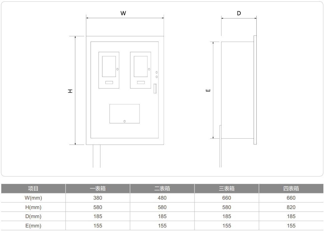 計量箱采用薄鋼板焊接結(jié)構(gòu),暗(明)裝懸掛式安裝?;镜某叽缫?guī)格見 表1: